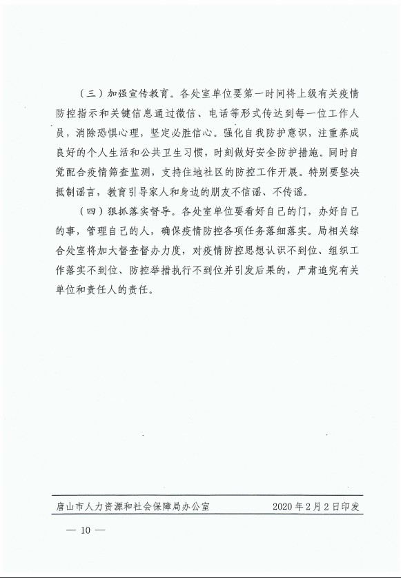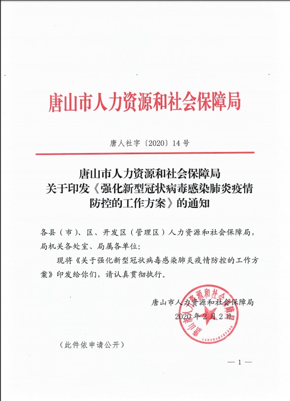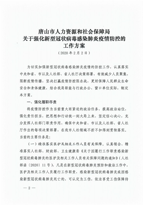 唐山市人社局关于印发《强化新型冠状病毒感染的肺炎疫情防控的工作方案》的通知
